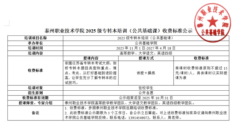 泰州职业技术学院2025级专转本培训(公共基础课)收费标准公示